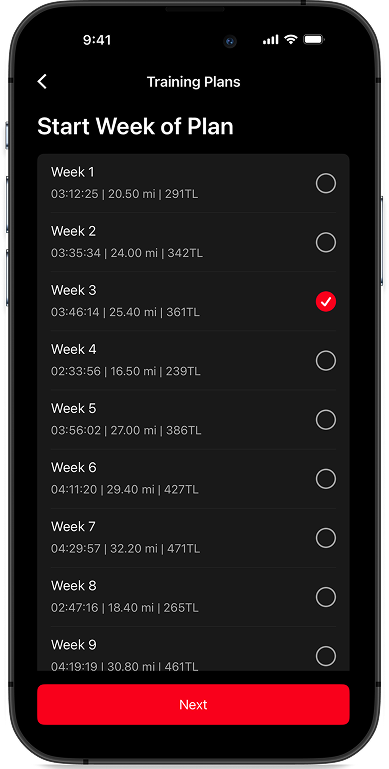 - Übersichtlich: Startest du z. B. in Woche 3, blendet die App die vorherigen Wochen automatisch aus – so bleibt der Fokus ganz auf den bevorstehenden Einheiten.